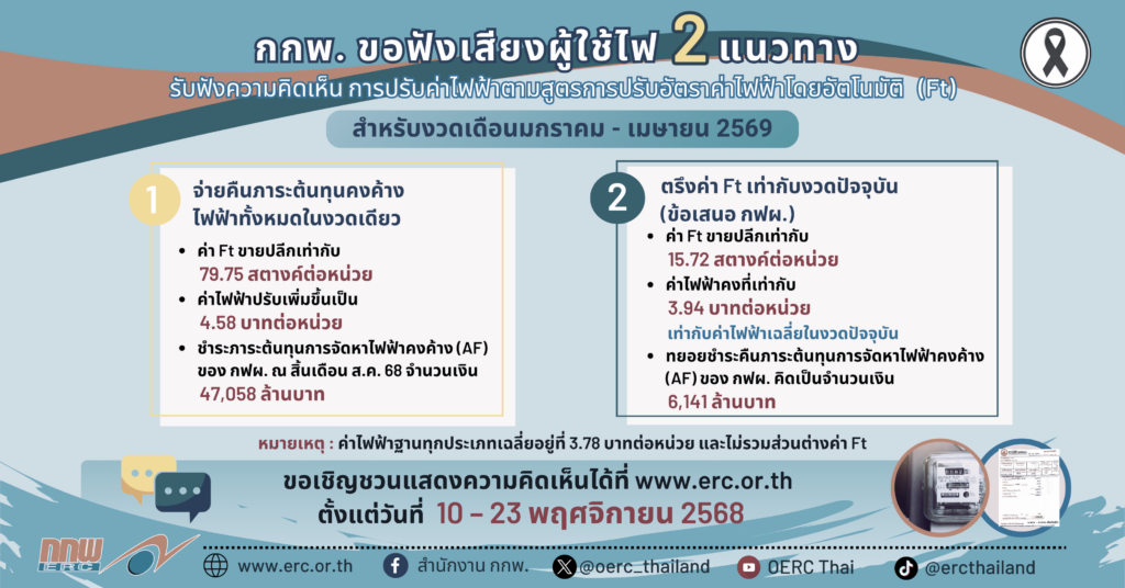 สำนักงานคณะกรรมการกำกับกิจการพลังงาน (สำนักงาน กกพ.) เสนอ 2 ทางเลือกในการปรับค่าไฟฟ้างวดเดือน ม.ค.-เม.ย. 2569 คือ ทางเลือกที่ 1 ชำระคืนหนื้ กฟผ. ในครั้งเดียวหมด 47,058 ล้านบาท ส่งผลให้ค่า Ft แตะ 79.75 สตางค์ต่อหน่วย แต่ค่าไฟฟ้าเฉลี่ยจะปรับขึ้นมาอยู่ที่ 4.58 บาทต่อหน่วย ส่วนทางเลือกที่ 2 คือตรึงค่า Ft ที่ 15.72 สตางค์ต่อหน่วย ค่าไฟฟ้าจะอยู่เท่าเดิมที่ 3.94 บาทต่อหน่วย ทยอยจ่ายคืนหนี้ กฟผ. ครั้งละ 6,141 ล้านบาท พร้อมเปิดรับฟังความเห็นประชาชนระหว่าง 10-23 พ.ย. 2568 นี้
