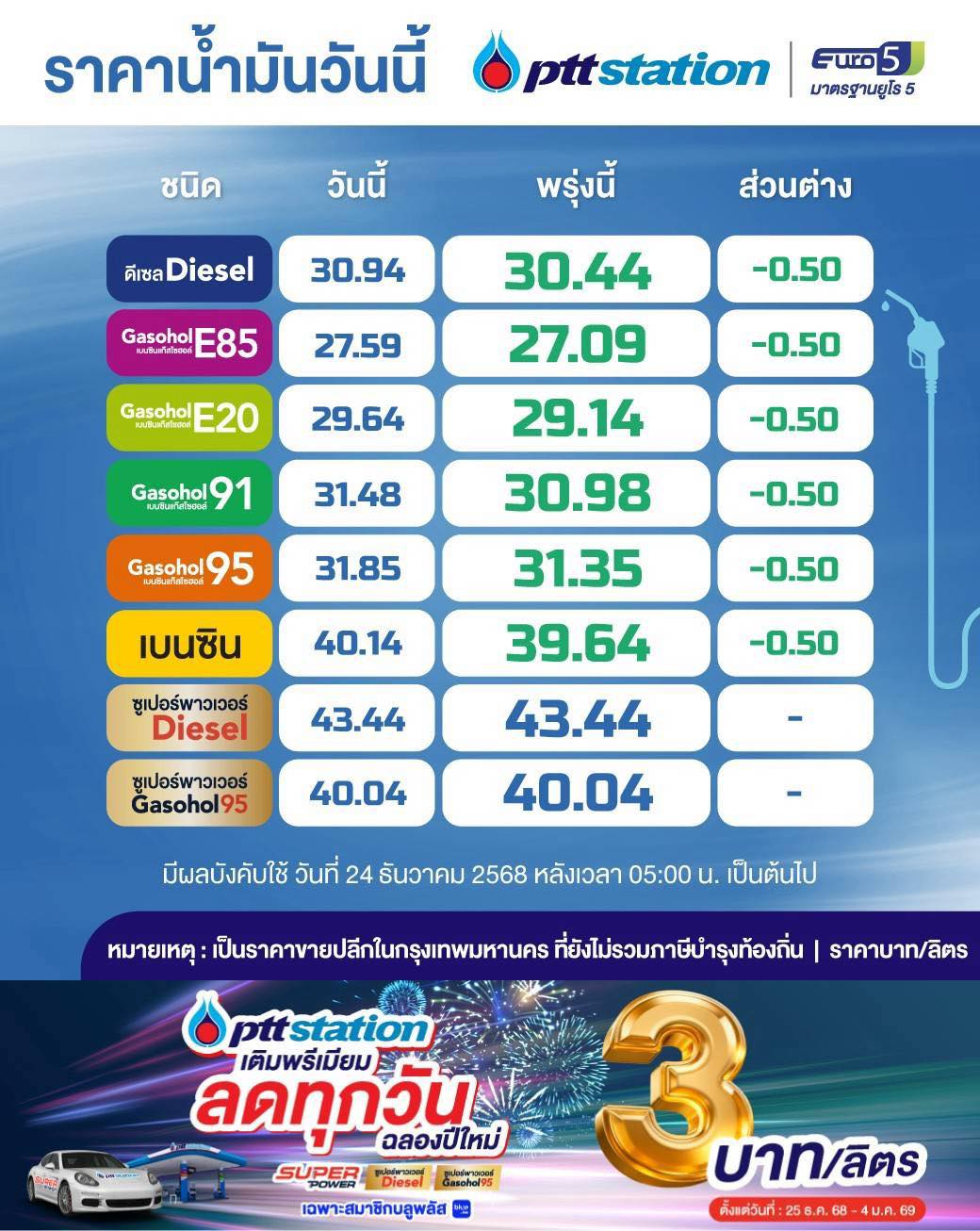 ข่าวดี! ปั๊ม ปตท. ปรับลดราคาน้ำมัน เกรดมาตรฐานทุกชนิด 50 สตางค์/ลิตร มีผลวันที่ 24 ธ.ค. 68 ตั้งแต่เวลา 05:00 เป็นต้นไป