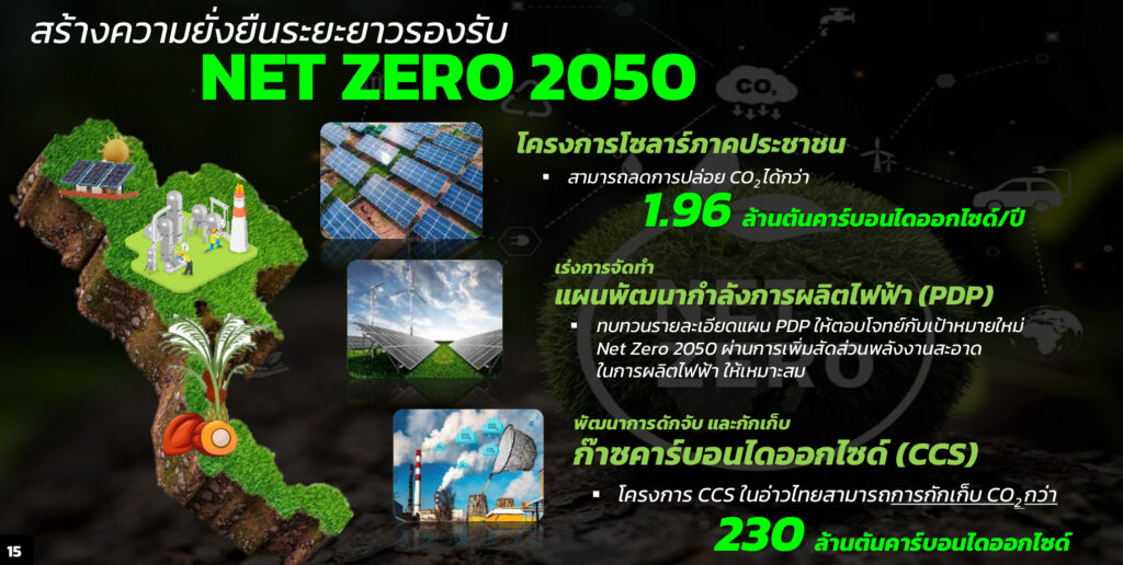 สำหรับการจัดทำแผนพัฒนากำลังผลิตไฟฟ้าของประเทศฉบับใหม่ ถือเป็นการสร้างความยั่งยืนระยะยาว รองรับเป้าหมาย Net Zero 2050 โดยจะต้องมีการจัดทำพยากรณ์ความต้องการใช้ไฟฟ้าใหม่ การเพิ่มสัดส่วนพลังงานหมุนเวียนให้มากขึ้นจากแผนPDP2018 rev1 ที่ใช้อยู่ในปัจจุบัน และการเพิ่มสัดส่วนพลังงานภาคประชาชนจากนโยบาย Quick Big Win