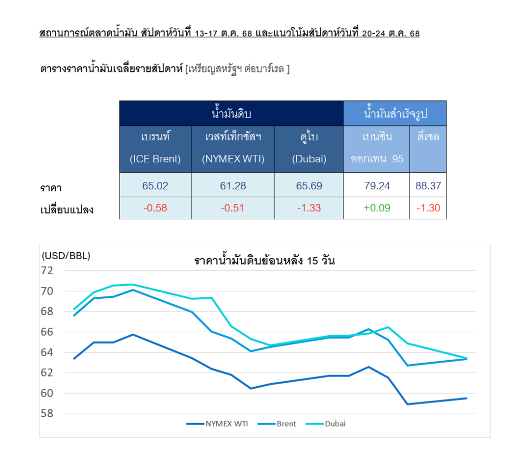 หน่วยธุรกิจการค้าระหว่างประเทศ บริษัท ปตท. จำกัด (มหาชน) รายงานสถานการณ์ตลาดน้ำมันโลก ประจำสัปดาห์วันที่ 13-17 ต.ค. 68 และแนวโน้มในสัปดาห์วันที่ 20-24 ต.ค. 68 โดยระบุว่าราคาน้ำมันถูกกดดัน โดยตลาดจับตาสงครามการค้าระหว่างสหรัฐฯ และจีน อย่างใกล้ชิด