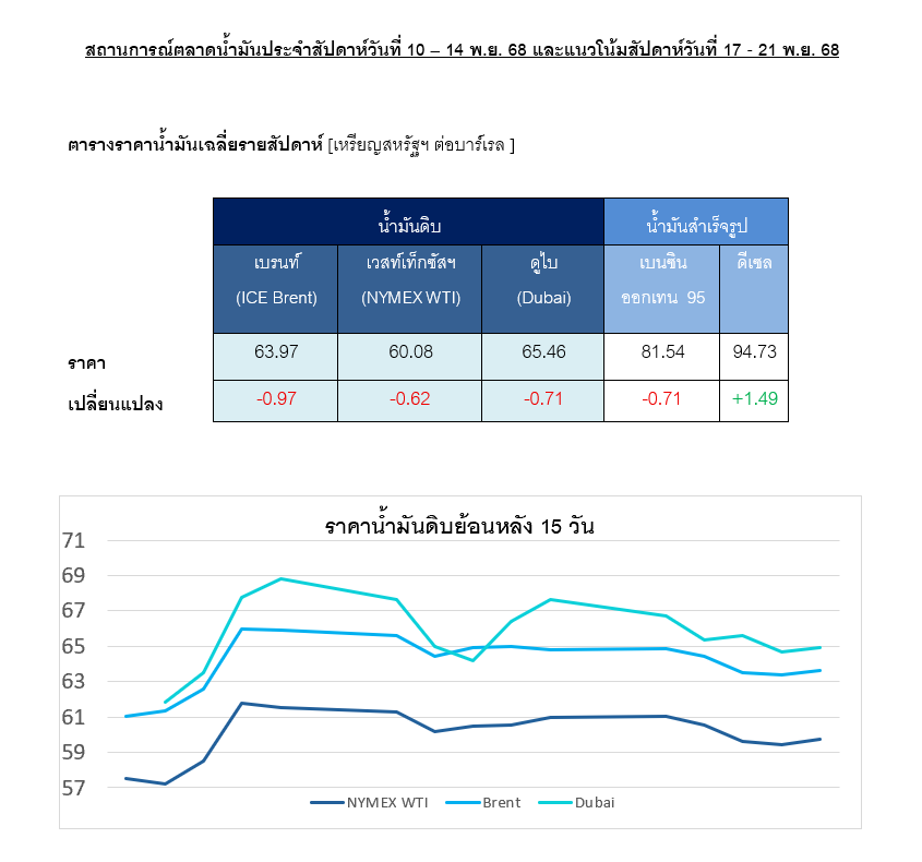 หน่วยธุรกิจการค้าระหว่างประเทศ บริษัท ปตท. จำกัด (มหาชน) รายงานสถานการณ์ตลาดน้ำมัน ประจำสัปดาห์วันที่ 10 – 14 พ.ย. 68 และแนวโน้มในสัปดาห์วันที่ 17 – 21 พ.ย. 68 โดยระบุว่า ราคาน้ำมันทรงตัว ตลาดจับตาสหรัฐฯ เตรียมลงมติในร่างกฎหมายเพื่อกลับมาเปิดหน่วยงานภาครัฐชั่วคราว