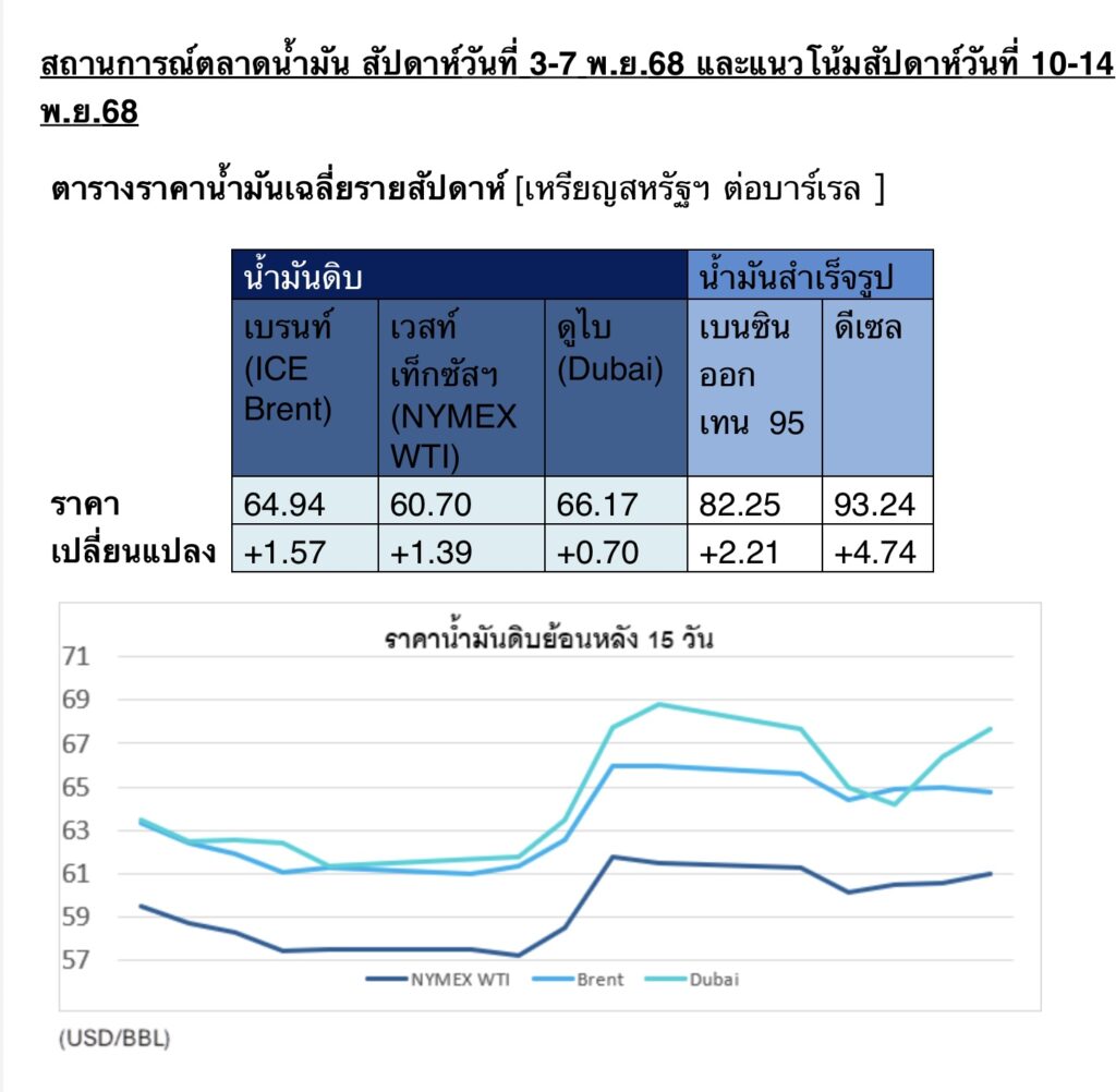 หน่วยธุรกิจการค้าระหว่างประเทศ บริษัท ปตท. จำกัด (มหาชน) รายงานสถานการณ์ตลาดน้ำมัน ประจำสัปดาห์วันที่ 3 – 7 พ.ย. 68 และแนวโน้มในสัปดาห์วันที่ 10 – 14 พ.ย. 68 โดยระบุว่าตลาดน้ำมันได้รับแรงหนุนจากมาตรการคว่ำบาตรบริษัทน้ำมันรัสเซียของชาติตะวันตกและสงครามการค้าส่อเค้าคลี่คลาย