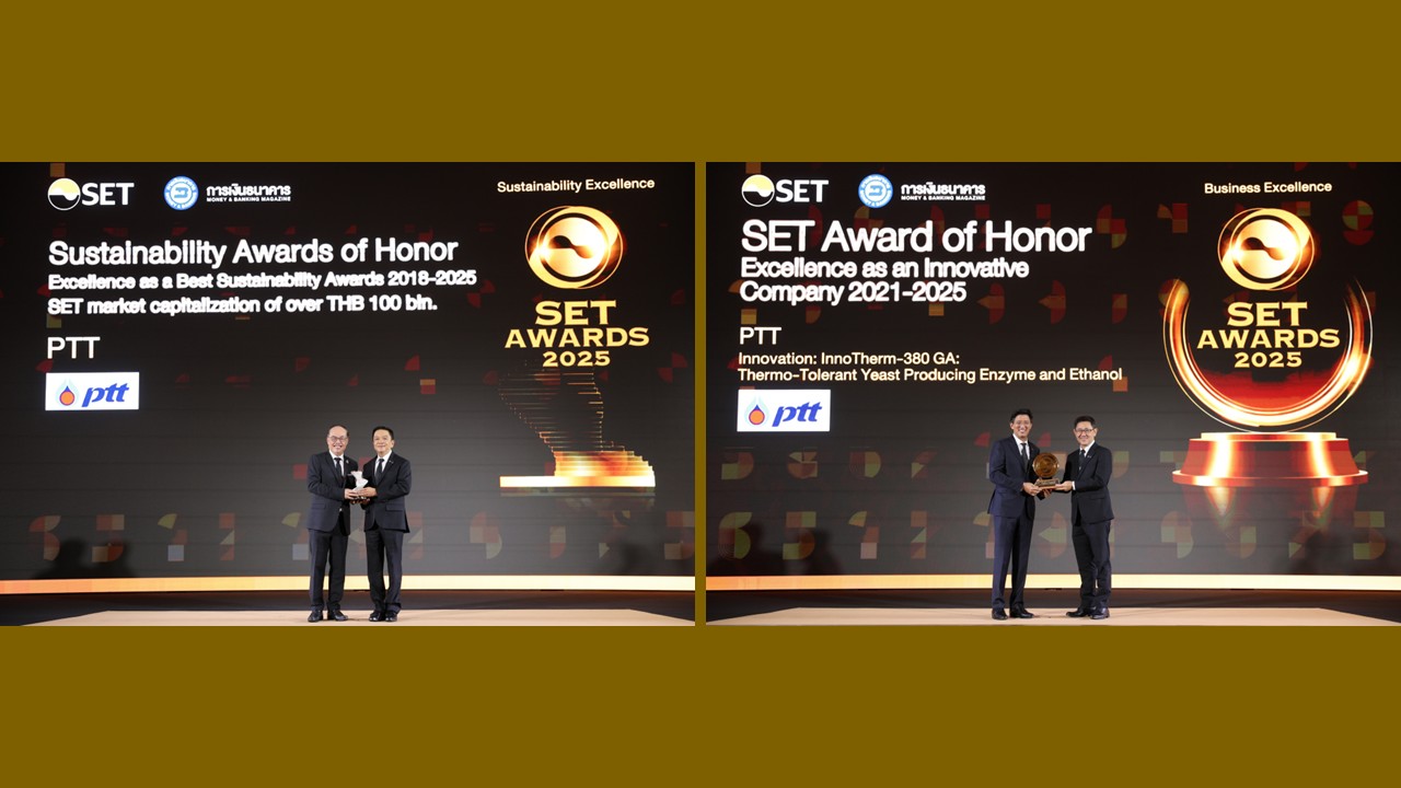 รางวัล SET Awards of Honor: Best Innovative Company Awards ปตท. ได้รับเป็นปีที่ 3 โดยปีนี้ได้รับจาก “นวัตกรรม InnoTherm-380 GA” เทคโนโลยีชีวภาพที่ช่วยยกระดับประสิทธิภาพการผลิตเอทานอลจากมันสำปะหลัง ลดต้นทุน เพิ่มผลผลิต และเสริมความสามารถในการแข่งขันของอุตสาหกรรมไทย ลดการพึ่งพาการนำเข้า และต่อยอดสู่ธุรกิจพลังงานชีวภาพในอนาคต นวัตกรรมนี้จดอนุสิทธิบัตรและใช้งานจริงในโรงงานเอทานอลรายใหญ่แล้ว พร้อมเดินหน้าขยายผลสู่โรงงานอื่น ๆ เพิ่มเติม