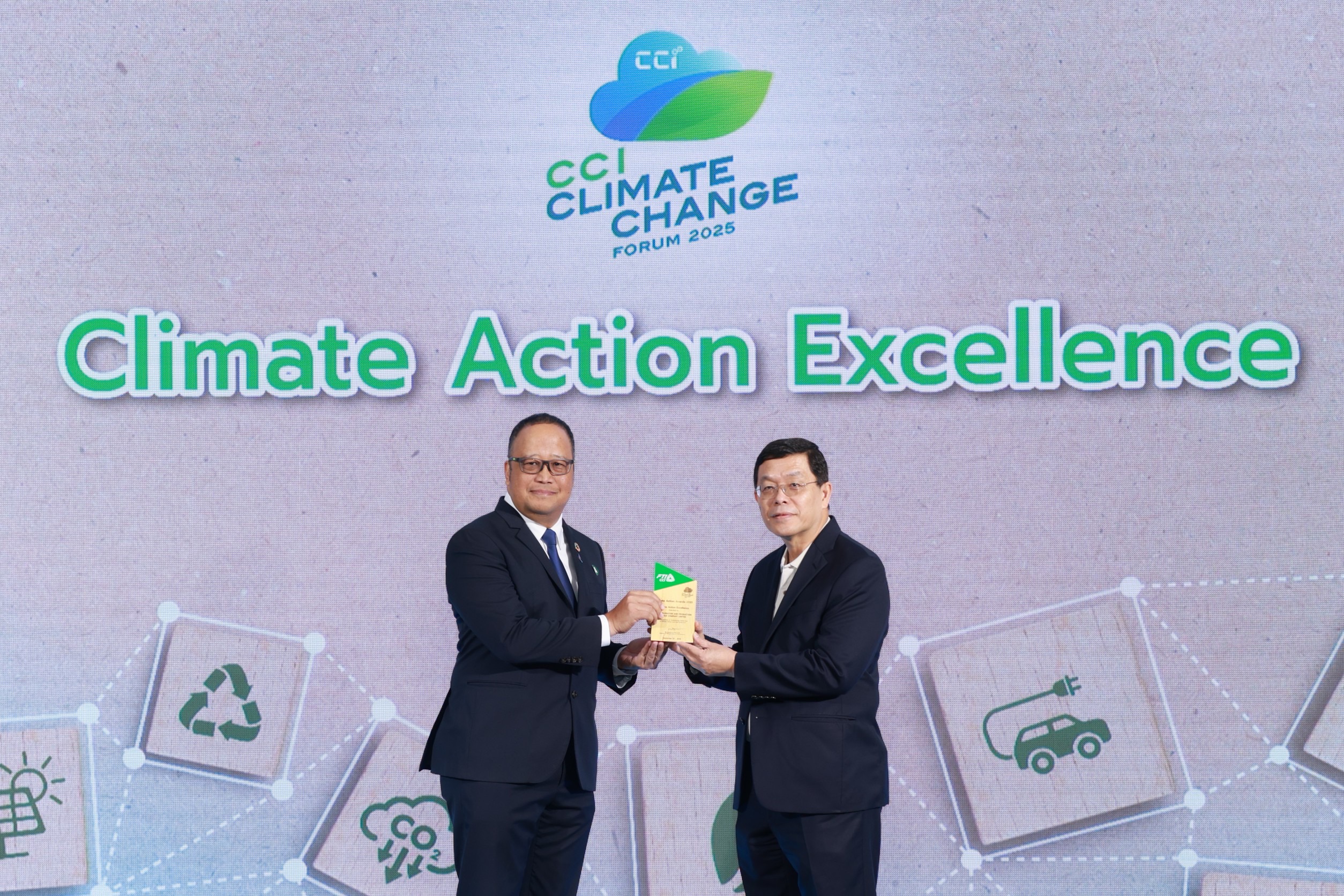 บริษัท ปตท.สำรวจและผลิตปิโตรเลียม จำกัด (มหาชน) หรือ ปตท.สผ. โดยนายดิษฐพล สุทธิโอสถ (ซ้าย) ผู้ช่วยกรรมการผู้จัดการใหญ่ สายงานบริหารเทคโนโลยี รับมอบรางวัล Climate Action Excellence ซึ่งเป็นรางวัลสูงสุดภายใต้การประกวด Climate Action Awards 2025 จากนายกิตติพงศ์ ลิ่มสุวรรณโรจน์ (ขวา) กรรมการบริหารและประธาน Climate Change Pillar สภาอุตสาหกรรมแห่งประเทศไทย (ส.อ.ท.) โดย ปตท.สผ. ได้รับรางวัลดังกล่าวจากความโดดเด่นในการดำเนินงานด้าน Climate Action ซึ่งสะท้อนถึงการให้ความสำคัญในการดำเนินธุรกิจอย่างยั่งยืน และการเป็นแบบอย่างที่ดีในการขับเคลื่อนสู่เป้าหมายการปล่อยก๊าซเรือนกระจกสุทธิเป็นศูนย์ (Net Zero Emissions) โดยมีโครงการสำคัญต่าง ๆ ที่สนับสนุนการลดการปล่อยก๊าซเรือนกระจก เช่น โครงการดักจับและกักเก็บคาร์บอนไดออกไซด์ (Carbon Capture and Storage: CCS) ที่โครงการอาทิตย์ การปลูกและบำรุงรักษาป่าเพื่อเพิ่มพื้นที่สีเขียว ฯลฯ