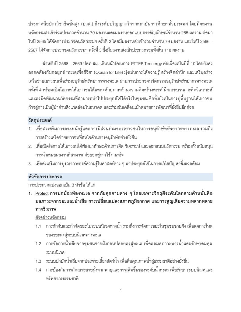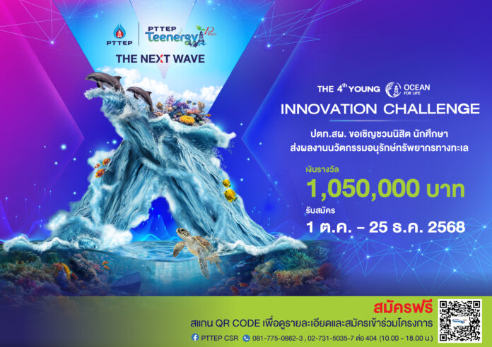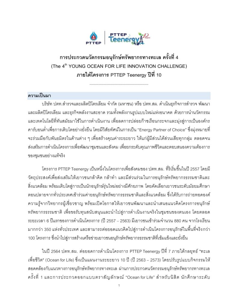 มาร่วมการประกวดนวัตกรรมอนุรักษ์ทรัพยากรทางทะเล ครั้งที่ 4 ในโครงการ PTTEP Teenergy ปีที่ 10 เพื่อสร้างสรรค์นวัตกรรมในการดูแลท้องทะเลไทยอย่างยั่งยืน ภายใต้แนวคิด “ทะเลเพื่อชีวิต“ (Ocean for Life) ชิงเงินรางวัลรวม 1,050,000 บาท พร้อมโอกาสในการพัฒนานวัตกรรม ต่อยอดสู่การใช้งานจริง