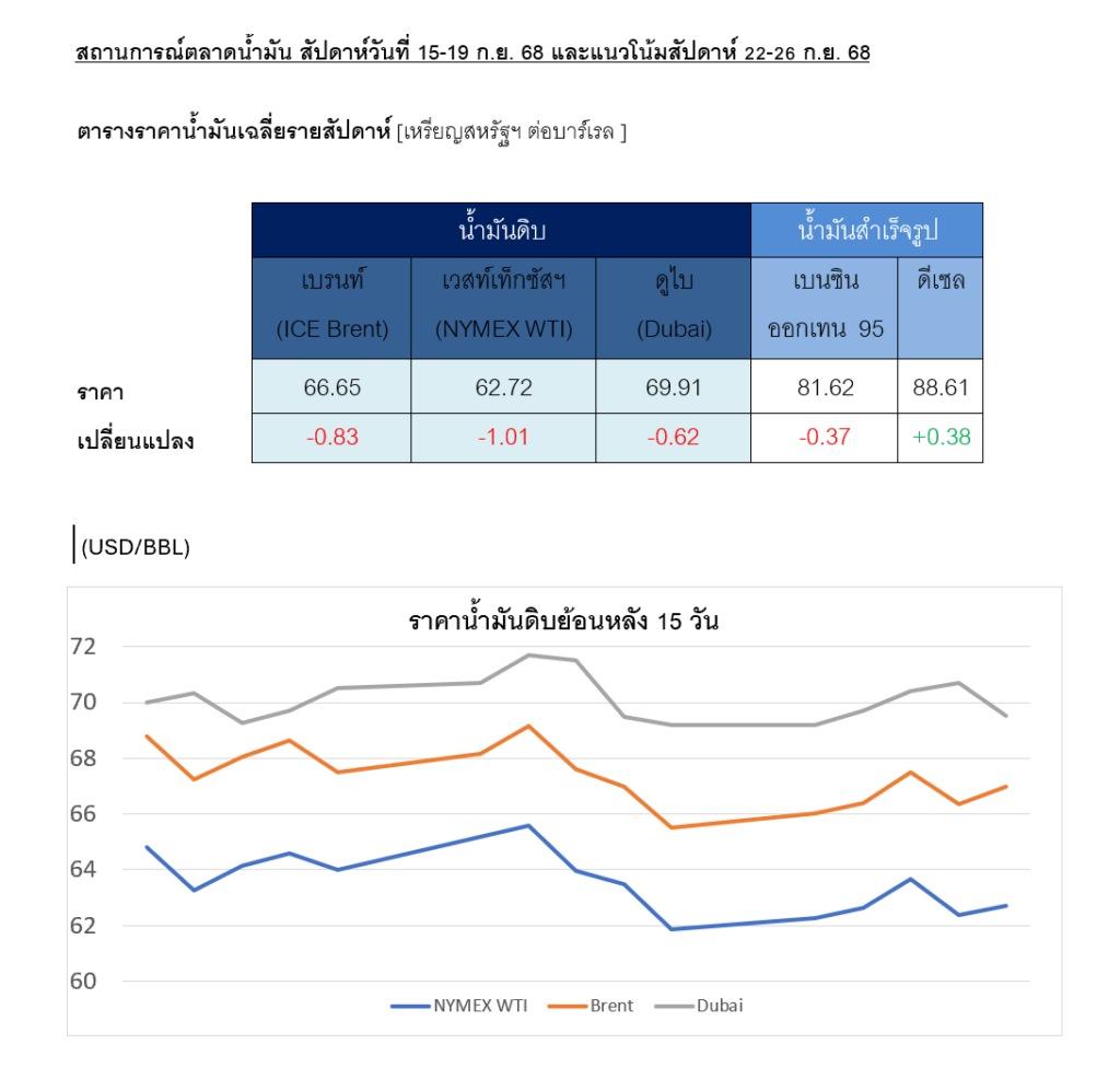 หน่วยธุรกิจการค้าระหว่างประเทศ บริษัท ปตท. จำกัด (มหาชน) รายงานสถานการณ์ตลาดน้ำมัน ประจำสัปดาห์วันที่ 15-19 ก.ย. 68 และแนวโน้มในสัปดาห์วันที่ 22-26 ก.ย. 68 โดยระบุว่าราคาน้ำมันดิบได้รับแรงหนุนจากยูเครนโจมตีโครงสร้างพื้นฐานพลังงานของรัสเซีย