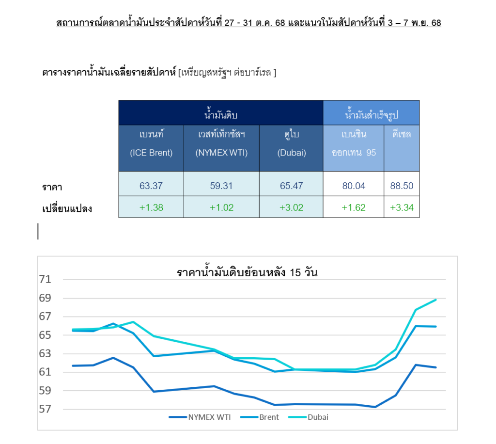 หน่วยธุรกิจการค้าระหว่างประเทศ บริษัท ปตท. จำกัด (มหาชน) รายงาน สถานการณ์ตลาดน้ำมันประจำสัปดาห์วันที่ 27 – 31 ต.ค. 68 และแนวโน้มในสัปดาห์วันที่ 3 – 7 พ.ย. 68 โดยชี้ว่าราคาน้ำมันดิบได้แรงหนุนจากมาตรการคว่ำบาตรรัสเซียระลอกใหม่
