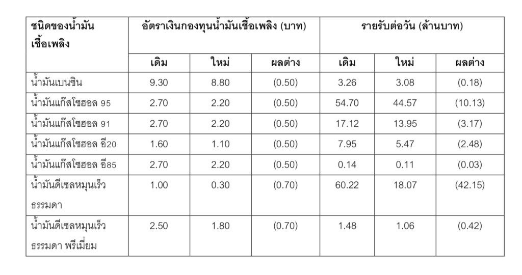 สำหรับการปรับลดเงินส่งเข้ากองทุนน้ำมันฯ ครั้งนี้ จะทำให้รายรับของกองทุนน้ำมันฯ เหลือวันละ 86.67 ล้านบาท จากเดิมมีรายรับวันละ 145.22 ล้านบาท (รวมน้ำมันเตาวันละ 0.36 ล้านบาท) ขณะที่ฐานะกองทุนน้ำมันเชื้อเพลิง ณ วันที่ 19 ตุลาคม 2568 ติดลบอยู่ที่ 14,754 ล้านบาท แต่ยังมีบัญชีน้ำมันเป็นบวก อยู่ที่ 26,910 ล้านบาท และบัญชี LPG ติดลบอยู่ที่ 41,664 ล้านบาท