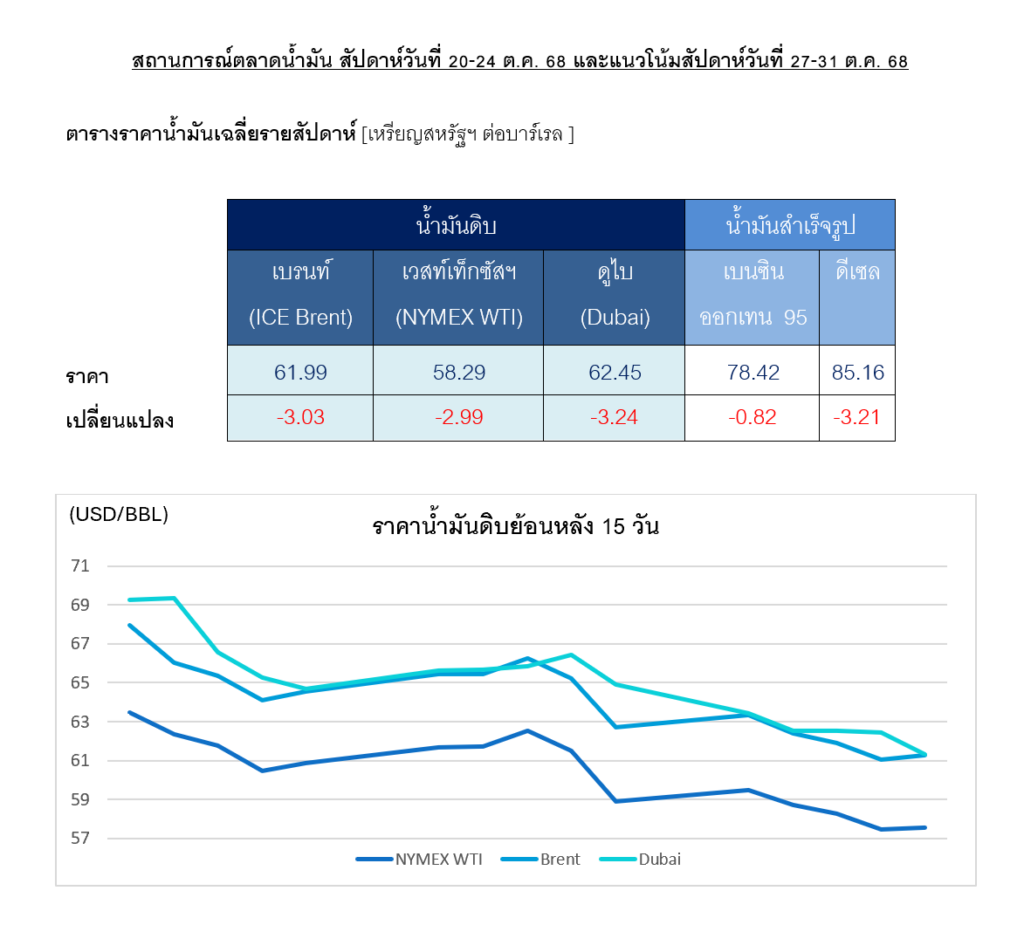 หน่วยธุรกิจการค้าระหว่างประเทศ บริษัท ปตท. จำกัด (มหาชน) รายงานสถานการณ์ตลาดน้ำมัน ประจำสัปดาห์วันที่ 20-24 ต.ค. 68 และแนวโน้มในสัปดาห์วันที่ 27 – 31 ต.ค. 68 โดยระบุว่า ราคาน้ำมันปรับลดลงเนื่องจากตลาดกำลังจับตาการประชุมระหว่างประธานาธิบดีสหรัฐฯ นาย Donald Trump กับประธานาธิบดีรัสเซีย นาย Vladimir Putin เพื่อยุติสงครามยูเครน