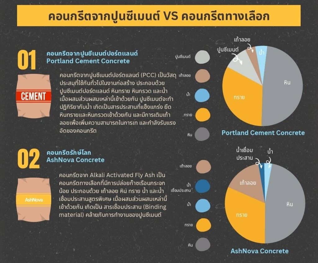 นอกจากนี้ สถานีชาร์จ EleX by EGAT ที่ทับสะแก ยังมีนวัตกรรมที่โดดเด่นคือการใช้คอนกรีตทางเลือกภายใต้แบรนด์ EGAT AshNova ซึ่งพัฒนามาจาก “เถ้าลอย” ผลพลอยได้จากกระบวนการผลิตไฟฟ้าของโรงไฟฟ้าแม่เมาะ จ.ลำปาง สามารถทดแทนปูนซีเมนต์ได้สูงสุดถึง 100% และมีคุณสมบัติพิเศษคือ กำลังรับแรงอัดสูง ทนทานต่อกรดและด่างสูง ช่วยลดต้นทุนการก่อสร้าง เพราะราคาถูกกว่าปูนซีเมนต์ และลดการปล่อยก๊าซคาร์บอนไดออกไซด์จากการผลิตซีเมนต์ได้ถึง 58%