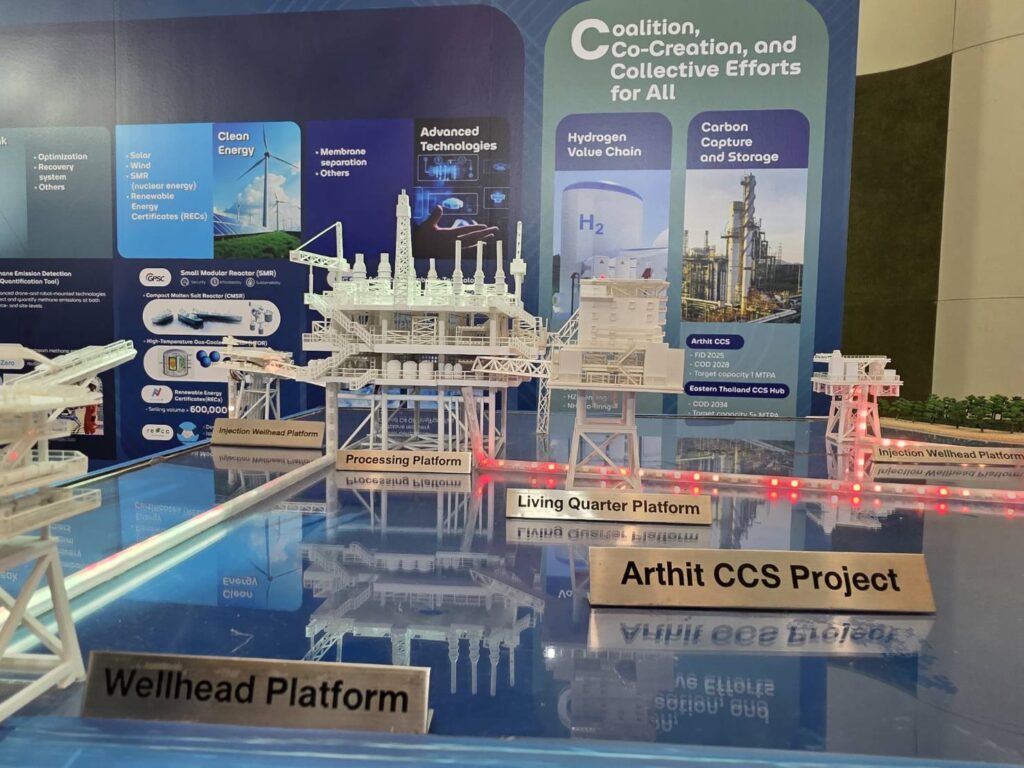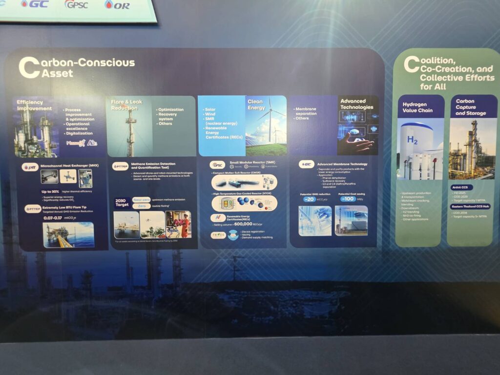 โดยกลุ่ม ปตท. จัดแสดง PTT Net Zero Pathway เพื่อให้ข้อมูลการดำเนินงานเพื่อขับเคลื่อนไปสู่เป้าหมายการปล่อยการเรือนกระจกสุทธิเป็นศูนย์ ผ่านการผลักดันโครงการต่างๆ อาทิ โครงการพัฒนาการดักจับและกักเก็บก๊าซคาร์บอนไดออกไซด์ (Carbon Capture and Storage – CCS) ที่มีการศึกษาความเป็นไปได้ในการใช้แหล่งอาทิตย์ซึ่งผลิตก๊าซธรรมชาติจนหมดแล้วเป็นแหล่งกักเก็บ คาดว่าจะ COD ในปี 2028 โดยมี capacity 1 ล้านตันต่อปี โครงการ Eastern Thailand CCS Hub ที่จะ COD ในปี 2023 ด้วยกำลังการผลิตเป้าหมายกว่า 5 ล้านตันต่อปี และโครงการพัฒนา Hydrogen Value Chain ของกลุ่ม ปตท. ตั้งแต่ต้นน้ำ กลางน้ำ จนถึงอุตสาหกรรมปลายน้ำ เพื่อตอกย้ำทิศทางการเดินหน้าสู่เป้าหมาย Net Zero ของกลุ่ม นอกจากนั้น ยังมีการจัดแสดงทิศทางการดำเนินงานของบริษัทในกลุ่มที่สอดคล้องกับเป้าหมายการลดคาร์บอน รวมถึงการพัฒนาพลังงานสะอาดและผลิตภัณฑ์ที่เป็นมิตรต่อสิ่งแวดล้อม