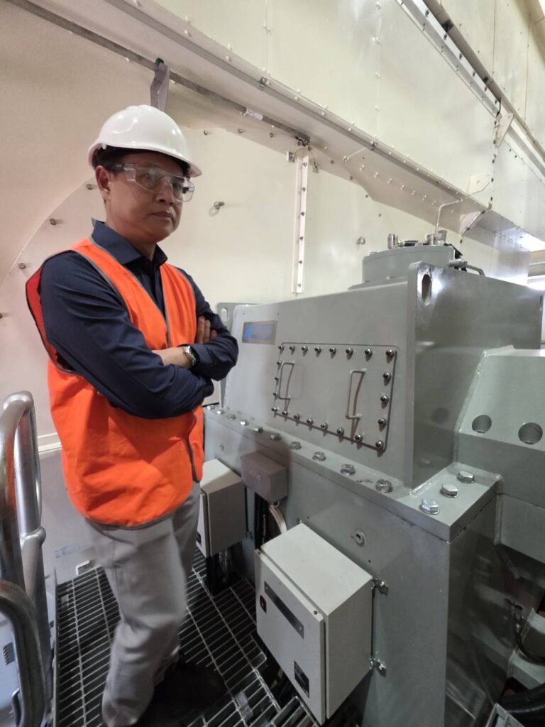 นิทัศน์ วรพนพิพัฒน์ กรรมการผู้จัดการใหญ่ ราช กรุ๊ป จำกัด (มหาชน) ยืนอยู่กับเครื่อง Synchronous Condenser