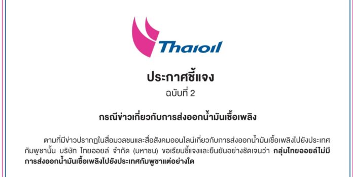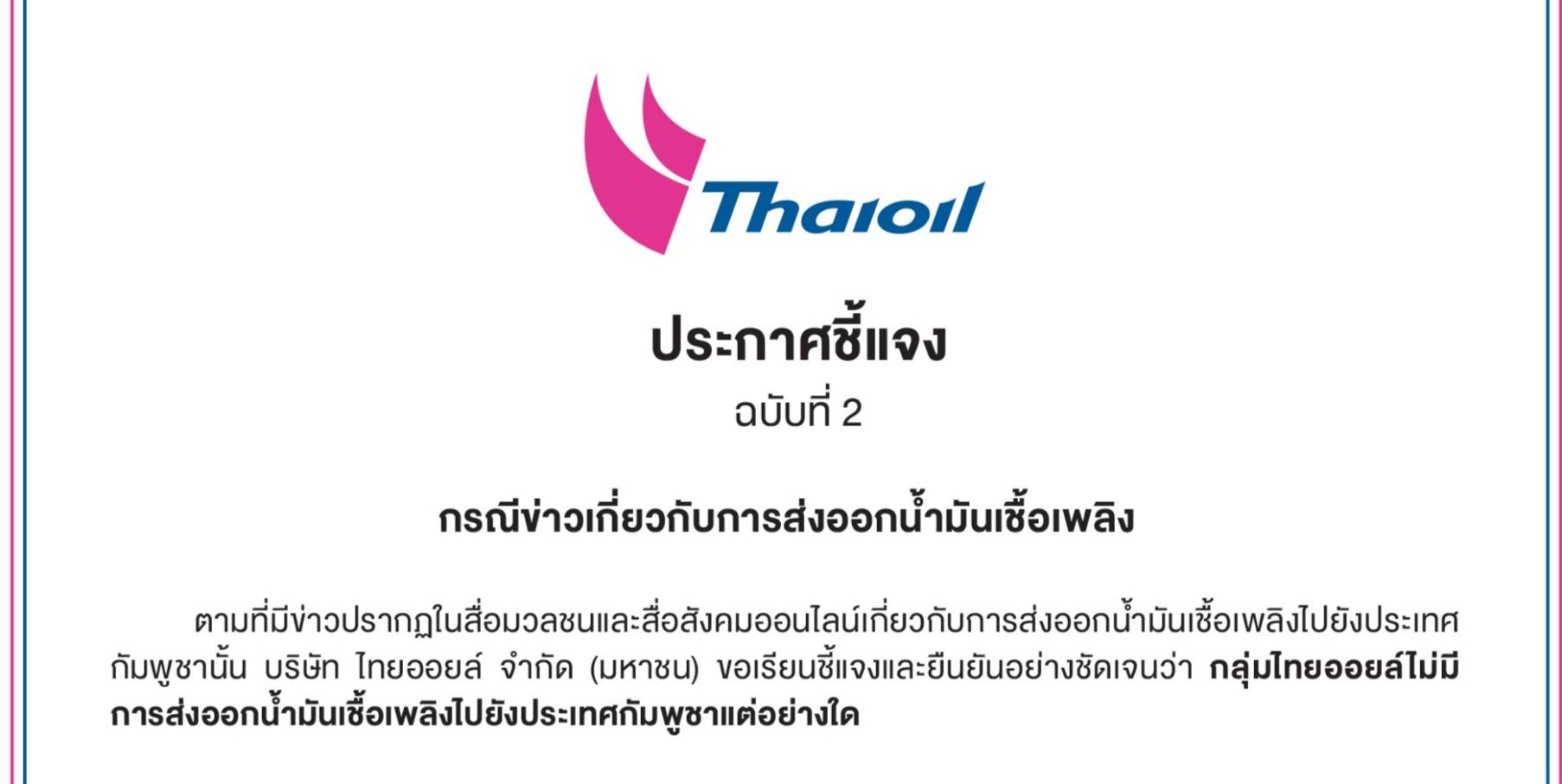 ตามที่มีข่าวปรากฏในสื่อมวลชนและสื่อสังคมออนไลน์เกี่ยวกับการส่งออกน้ำมันเชื้อเพลิงไปยังประเทศกัมพูชา นั้น บริษัท ไทยออยล์ จำกัด (มหาชน) ได้ออกแถลงการณ์ชี้แจง และยืนยันอย่างชัดเจนว่า กลุ่มไทยออยล์ไม่มีการส่งออกน้ำมันเชื้อเพลิงไปยังประเทศกัมพูชาแต่อย่างใด โดยบริษัท ฯ มี นโยบายงดการส่งออกน้ำมันเชื้อเพลิงไปยังประเทศกัมพูชาตั้งแต่เกิดกรณีพิพาทไทย-กัมพูชา ประมาณกลางปี พ.ศ. 2568 และได้ถือปฏิบัติตามนโยบายดังกล่าวอย่างเคร่งครัดและต่อเนื่องมาจนถึงปัจจุบัน สอดคล้องกับนโยบายของกระทรวงพลังงาน และคำนึงถึงความมั่นคงของประเทศและผลประโยชน์ของประชาชนเป็นสำคัญ ภายหลังจากกองทัพภาคที่ 2/ศูนย์ปฏิบัติการกองทัพภาคที่ 2 มีคำสั่งควบคุมการส่งออกน้ำมันเชื้อเพลิง ณ จุดผ่านแดนถาวรช่องเม็ก จังหวัดอุบลราชธานี ซึ่งมีผลบังคับใช้ตั้งแต่วันที่ 15 ธันวาคม พ.ศ. 2568 บริษัทฯ ได้ให้ความร่วมมือและปฏิบัติตามคำสั่งดังกล่าวอย่างเคร่งครัด โดยได้งดจำหน่ายน้ำมันเชื้อเพลิงเพื่อส่งออกไปนอกราชอาณาจักร ณ จุดผ่านแดนดังกล่าวทันที พร้อมกันนี้ บริษัทฯ ได้ปรับแผนการส่งออกน้ำมันให้สอดคล้องกับนโยบายด้านความมั่นคงแห่งชาติของภาครัฐ รวมถึงความต้องการใช้พลังงานของประชาชนไทยเป็นหลัก