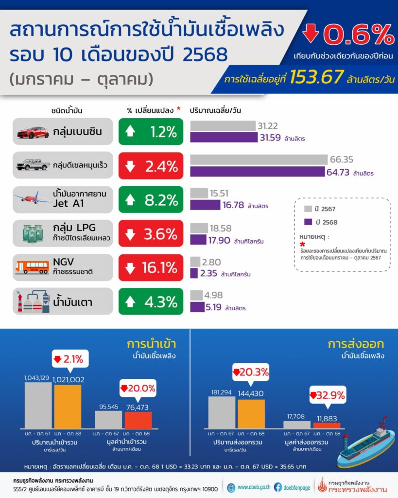 ส่วนภาพรวมการใช้น้ำมันเชื้อเพลิง ในช่วงเดือนมกราคม – ตุลาคม 2568 มีปริมาณอยู่ที่ 153.67 ล้านลิตร/วัน ลดลงร้อยละ 0.6 เมื่อเทียบกับช่วงเดียวกันของปีก่อน โดยก๊าซธรรมชาติสำหรับยานยนต์ (NGV) มีปริมาณการใช้ลดลงสูงสุด ที่ร้อยละ 16.1 ตามด้วยก๊าซปิโตรเลียมเหลว (LPG) ลดลงร้อยละ 3.6 และน้ำมันดีเซลหมุนเร็วลดลงร้อยละ 2.4 ขณะที่น้ำมันอากาศยานเชิงพาณิชย์ (Jet A1) มีปริมาณการใช้เพิ่มขึ้นร้อยละ 8.2 การใช้น้ำมันเตาเพิ่มขึ้นร้อยละ 4.3 และกลุ่มเบนซินเพิ่มขึ้นร้อยละ 1.2 โดยมีรายละเอียดปริมาณการใช้น้ำมันเชื้อเพลิงแต่ละชนิดเมื่อเทียบกับช่วงเวลาเดียวกันของปีก่อน ดังนี้