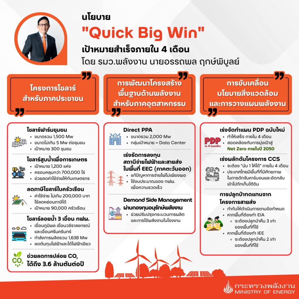 โดยจากนโยบาย Quick Big Win นี้ กระทรวงพลังงานคาดว่าจะกระตุ้นเศรษฐกิจได้ 7 แสนล้านบาท เกิดการจ้างงานกว่า 1.6 หมื่นตำแหน่ง ลดการปล่อยก๊าซคาร์บอนฯ ได้กว่า 10 ล้านตันคาร์บอนฯ ต่อปี และช่วยลดรายจ่ายด้านพลังงาน เพิ่มรายได้ให้แก่ชุมชน