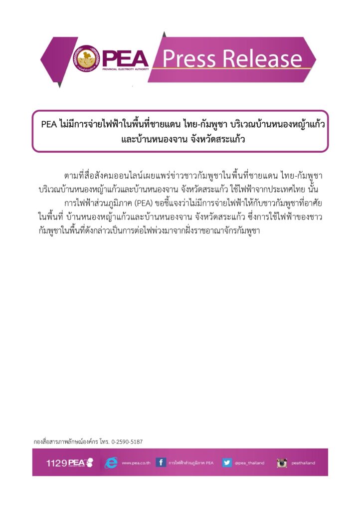 การไฟฟ้าส่วนภูมิภาค (PEA) ขอชี้แจงว่า ไม่มีการจ่ายไฟฟ้าให้กับชาวกัมพูชาที่อาศัยในพื้นที่ บ้านหนองหญ้าแก้วและบ้านหนองจาน จังหวัดสระแก้ว ซึ่งการใช้ไฟฟ้าของชาวกัมพูชาในพื้นที่ดังกล่าว เป็นการต่อไฟพ่วงมาจากฝั่งราชอาณาจักรกัมพูชา