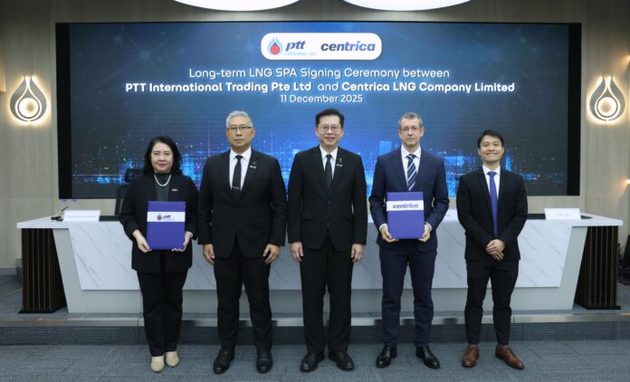 เมื่อเร็วๆ นี้ – PTT International Trading Pte Ltd (PTTT)  และ Centrica LNG Company Limited (Centrica) ลงนามในสัญญา LNG Sale and Purchase Agreement (SPA) สำหรับการซื้อขายก๊าซธรรมชาติเหลว (LNG) ระยะยาว ตามกรอบความร่วมมือในข้อตกลงเบื้องต้น (Heads of Agreement : HoA) ที่ลงนามเมื่อเดือนมิถุนายน 2568 ที่ผ่านมา โดยมี นายจตุรงค์ วรวิทย์สุรวัฒนา รองกรรมการผู้จัดการใหญ่หน่วยธุรกิจการค้าระหว่างประเทศ บริษัท ปตท. จำกัด (มหาชน) (ปตท.) (กลาง) นางธนันต์พร ตั้งพิทักษ์กุล รักษาการกรรมการผู้จัดการ PTTT (ซ้าย) นายไวธยางค์ กุลละวณิชย์ ผู้ช่วยกรรมการผู้จัดการใหญ่การค้าระหว่างประเทศกลุ่มผลิตภัณฑ์ปิโตรเลียมขั้นต้นและกิจการต่างประเทศ ปตท. (ที่ 2 จากซ้าย)และ Mr. Arturo Gallego, Executive Vice President, Global Head of LNG, Centrica (ที่ 2 จากขวา) ร่วมพิธี